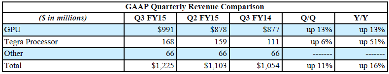 Nvidia’s revenue for the Q3 FY2015 totaled $1.225 billion, up 16 per cent from $1.05 billion a year earlier and up 11 per cent from $1.10 billion the previous quarter. Nvidia’s net income for the quarter was $173 million, operating expenses were around $463 million, whereas gross margin was 55.2 per cent. Revenue for the first three quarters of fiscal 2015 was a record $3.43 billion, up 15 per cent from $2.99 billion a year earlier.