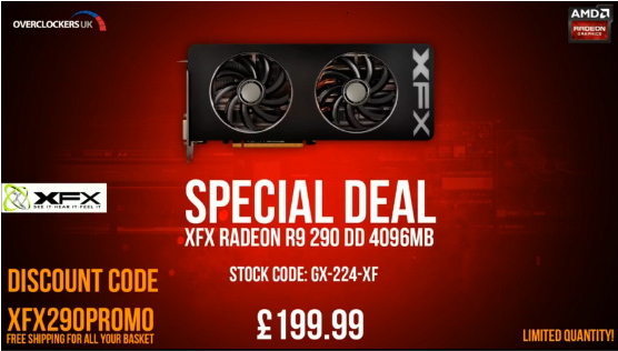 In a bid to get the XFX Radeon R9 290 4GB graphics card for £199, one needs to order it from Overclockers UK and enter the “XFX290PROMO” promo code to get the low price and free shipping for the whole order.