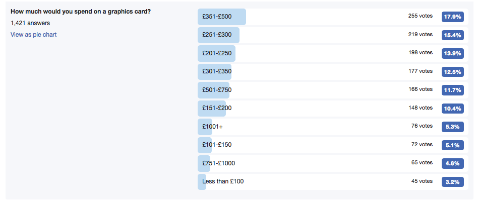 Of the readers polled on Saturday, almost 18% said that they would be willing to spend between £351 and £500 on a new graphics card. The second most popular price zone was between £250 and £300, with 15.4% saying that would be their preferred budget.
