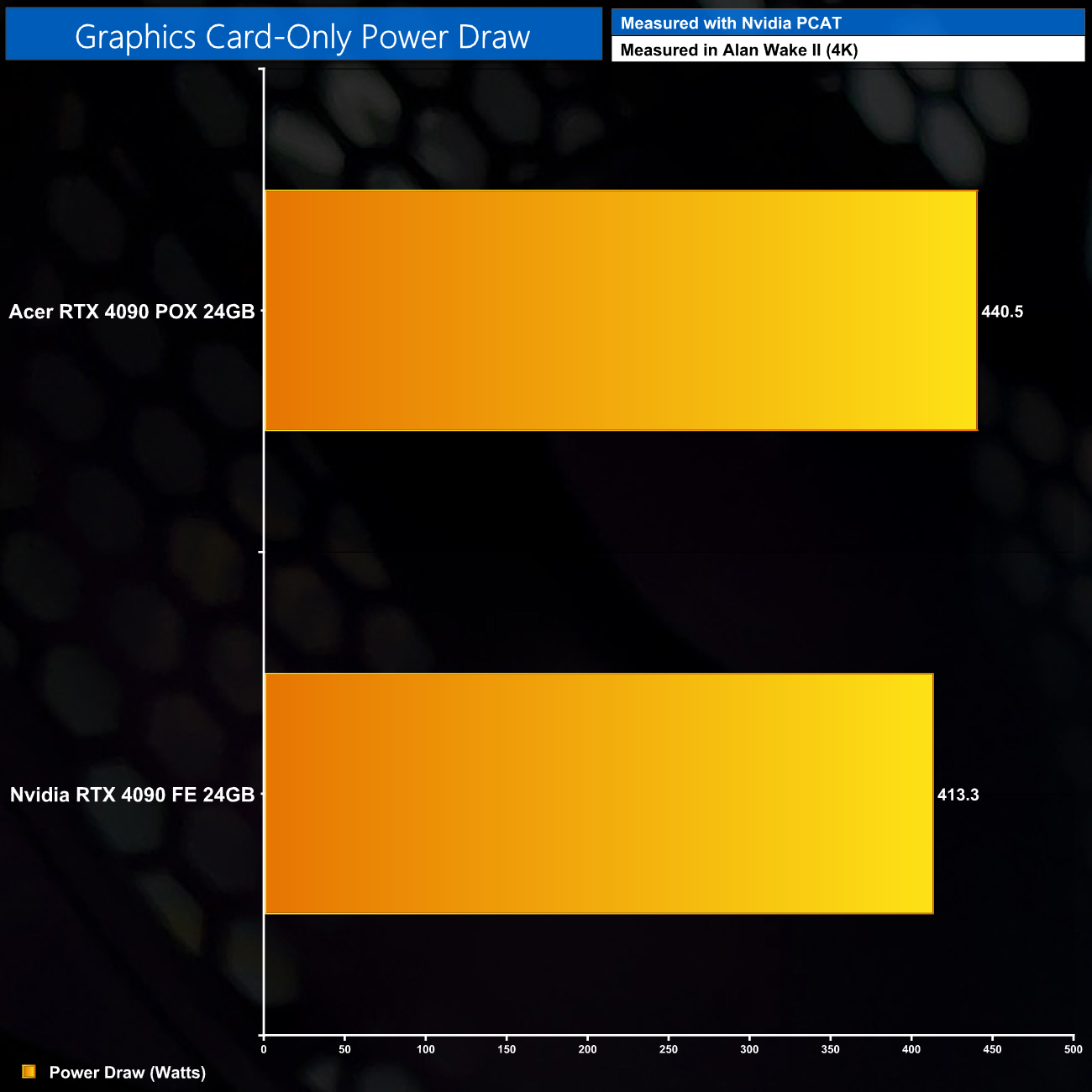 We only compare against the 4090 FE for our power testing we've started to use Alan Wake II for this. As we can see, the Acer 4090 does draw almost 30W more power than the FE – perhaps down to the less impressive PCB design, or it could just be the silicon lottery.