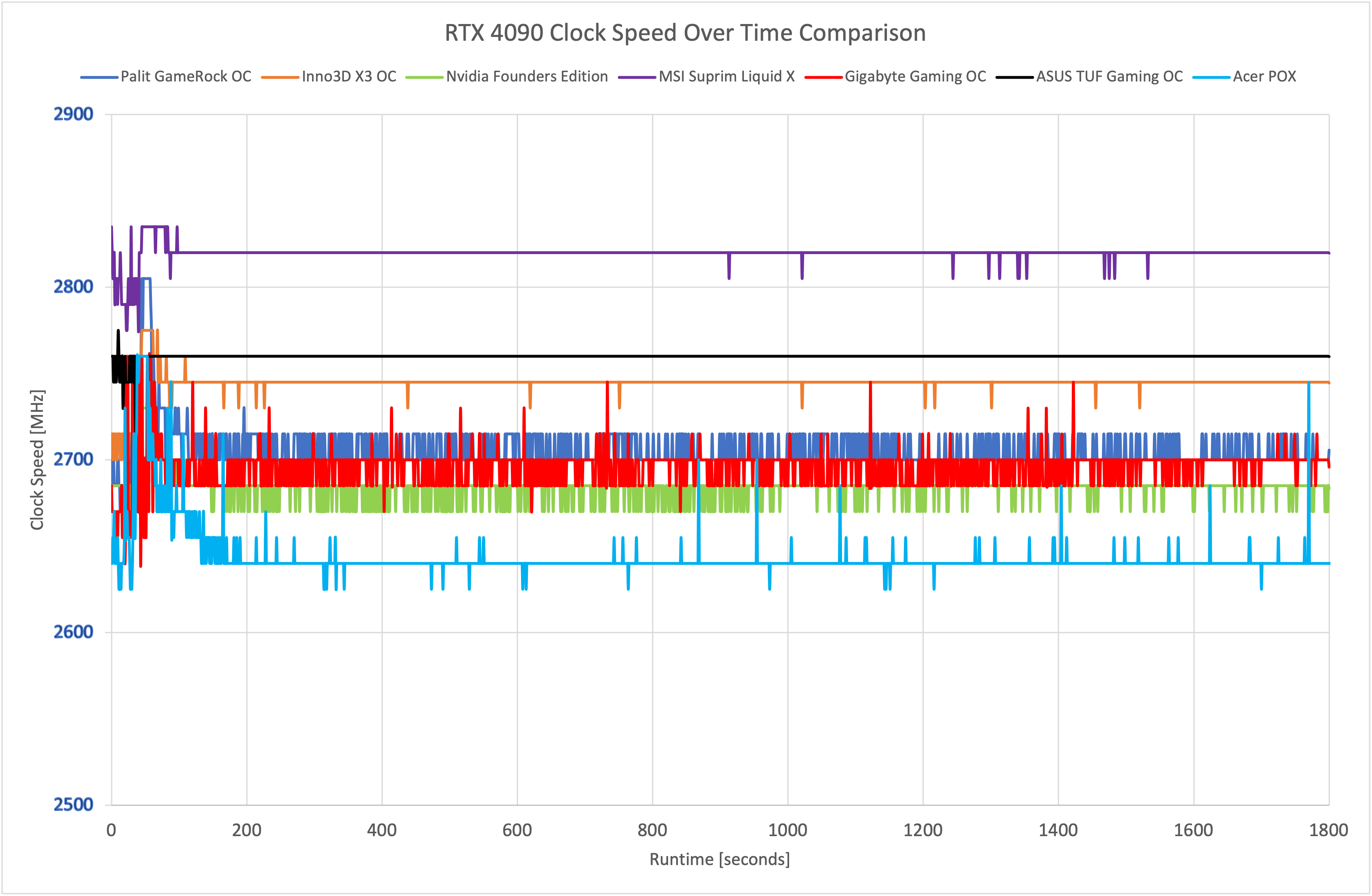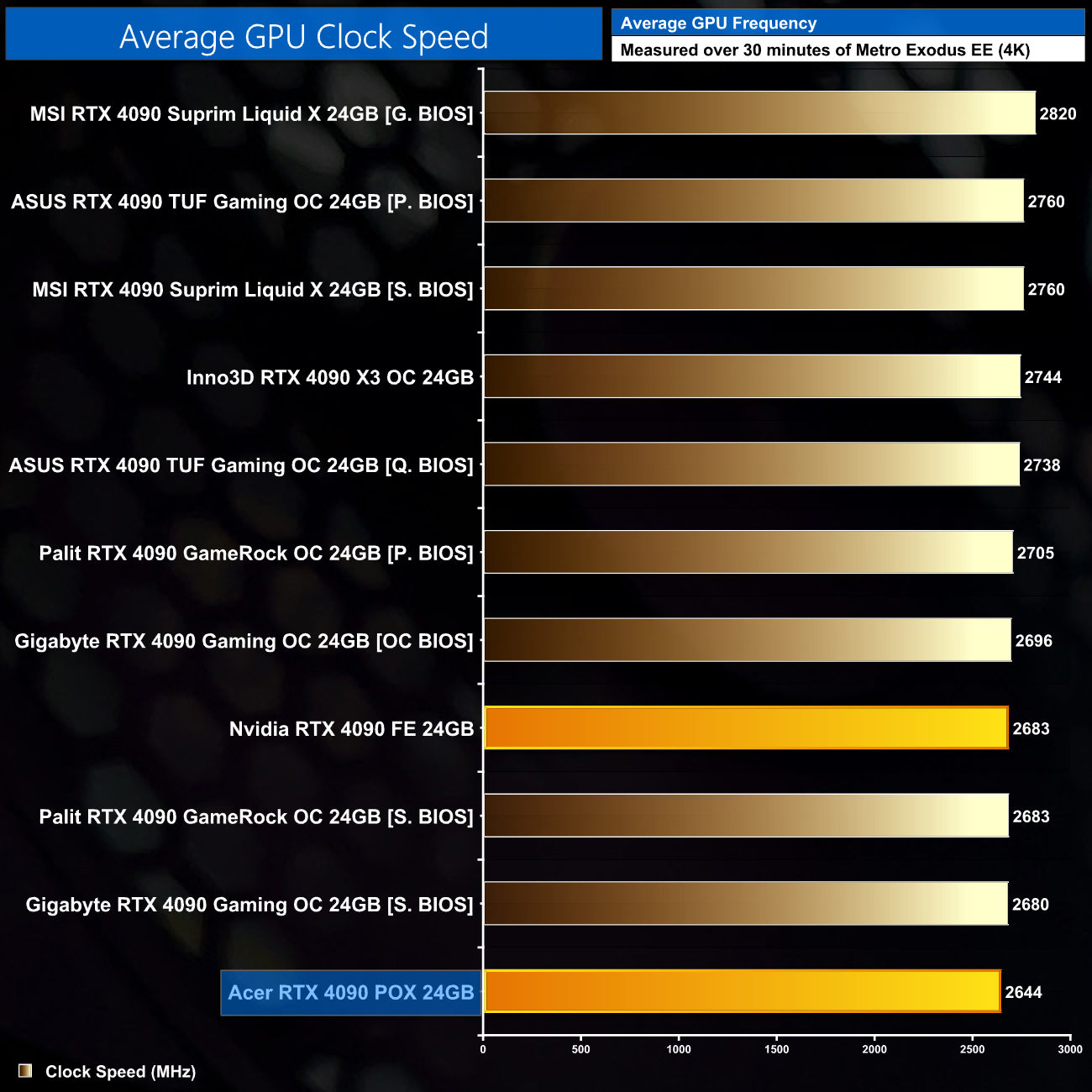 In terms of the long-duration clock speed, the Acer 4090 does run the slowest of any RTX 4090 we have tested to-date. It starts off by boosting as high as 2670MHz within the first two minutes of our stress-test, but then quickly settles at 2640Hz. On average it's only 40MHz slower than the Founders Edition so we're not talking significant differences here, but the likes of the Inno3D X3 OC and ASUS TUF Gaming OC do run about 100MHz faster on average.