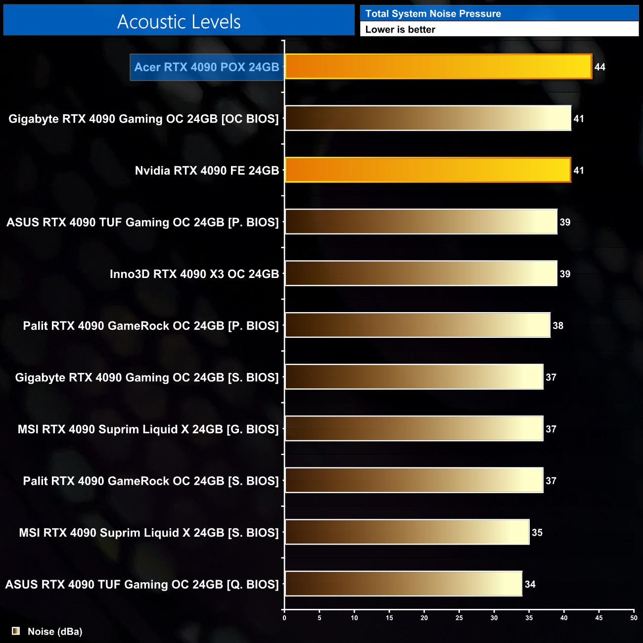 Adding salt to the wound is that the two 100mm fans run at quite a pace to cool the GPU and memory – we saw them hit 65%, which is just under 2000rpm, generating 44dBa of noise. That makes the Acer 4090 noticeably louder than even the Founders Edition, while it is a far cry from the likes of the TUF Gaming or GameRock OC.