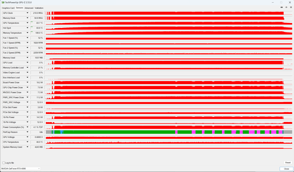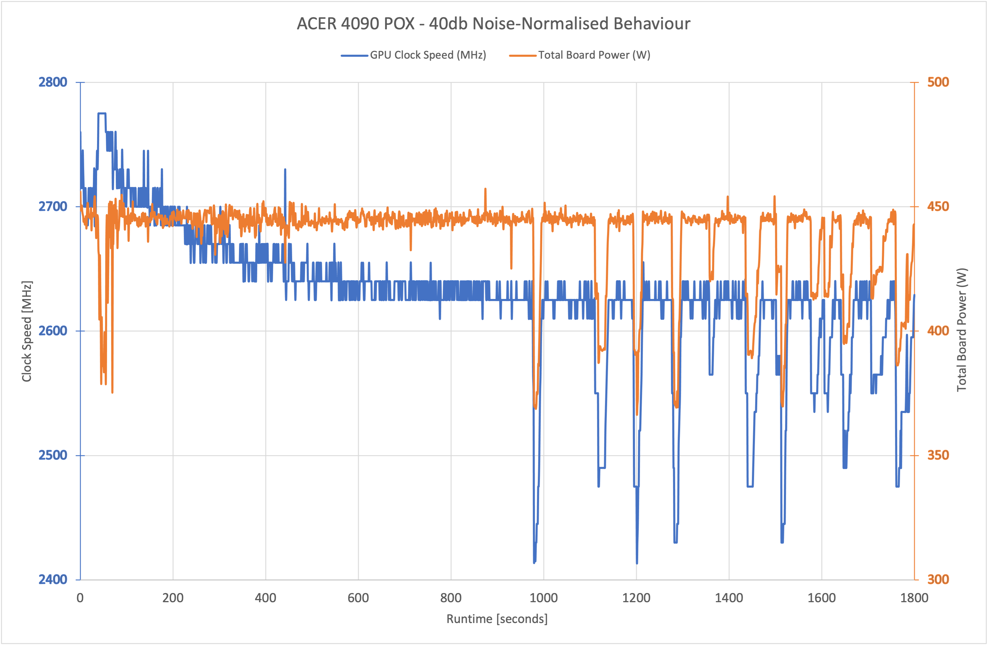 GPU-Z's handy ‘PerfCap Reason' indicates thermals are to blame for this (identified by the magenta sections of the otherwise green bar). This simply means the Acer 4090 is not able to run at 40dBa without significant issues, further hurting its viability as a standalone product.