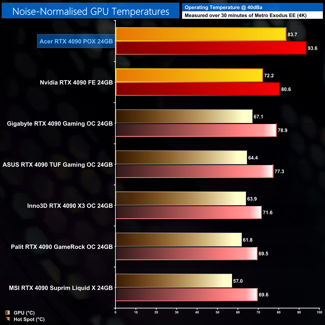We had to reduce fan speed to 52% – 1630rpm – for noise levels to hit 40dBa, where we then re-tested thermal performance. As expected, things got a fair bit worse due to the slower fan speed, with the GPU peaking just below 84C, with the hot spot at almost 94C. This, again, makes the Acer model the worst-performing 4090 we have tested.