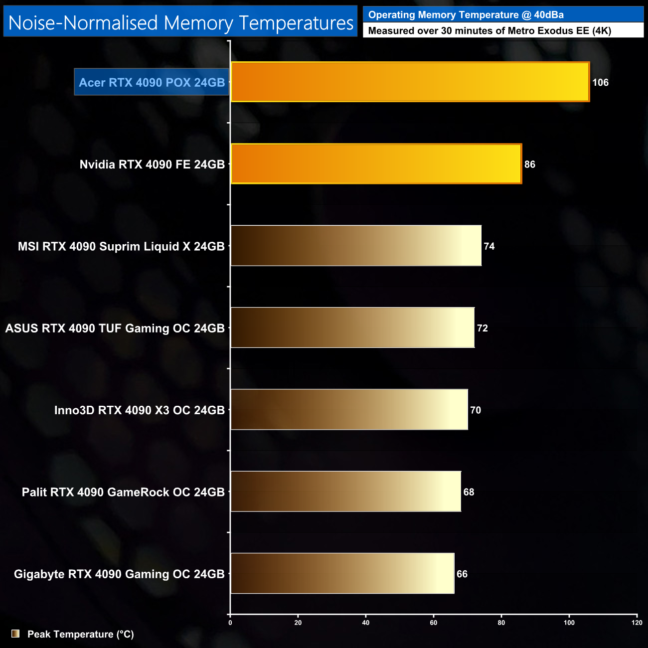 Noise-normalised memory thermals were even worse, running as hot at 106C (!) during our thirty minute stress test. It's not been overly clear in the past how hot GDDR6X is specified to run, though these particular Micron chips are listed at ‘+95C' on the product page, so 106C is clearly well over that figure.