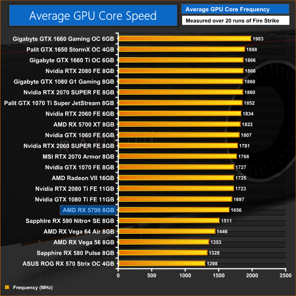 As we mentioned on the first page, AMD has introduce a new ‘game clock' metric for the Navi GPUs – essentially, this is the sort of clock speed you should expect from the card while gaming, and it is lower than the rated boost clock. For the RX 5700, the game clock is rated at ‘up to 1625MHz', so we put this to the test with our usual loop of 3DMark Fire Strike.