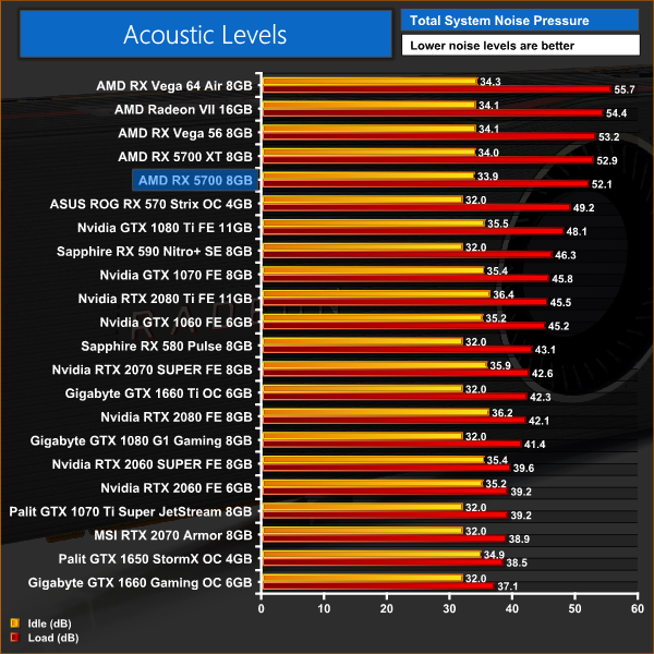 Despite the OK thermal performance, AMD's reference card remains loud. It is not quite as turbo-charged as Vega 64, but this still produces a significant racket – it's 4dB louder than the nearest Nvidia card, and that happens to be the GTX 1080 Ti. As ever, we are reliant on custom cards to bring noise levels in check – as things stand, you'll almost certainly want to game with a headset on.