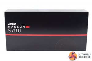 The AMD Radeon RX 5700 ships in a compact black box, with just product branding and a red strip visible on the front.