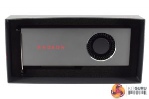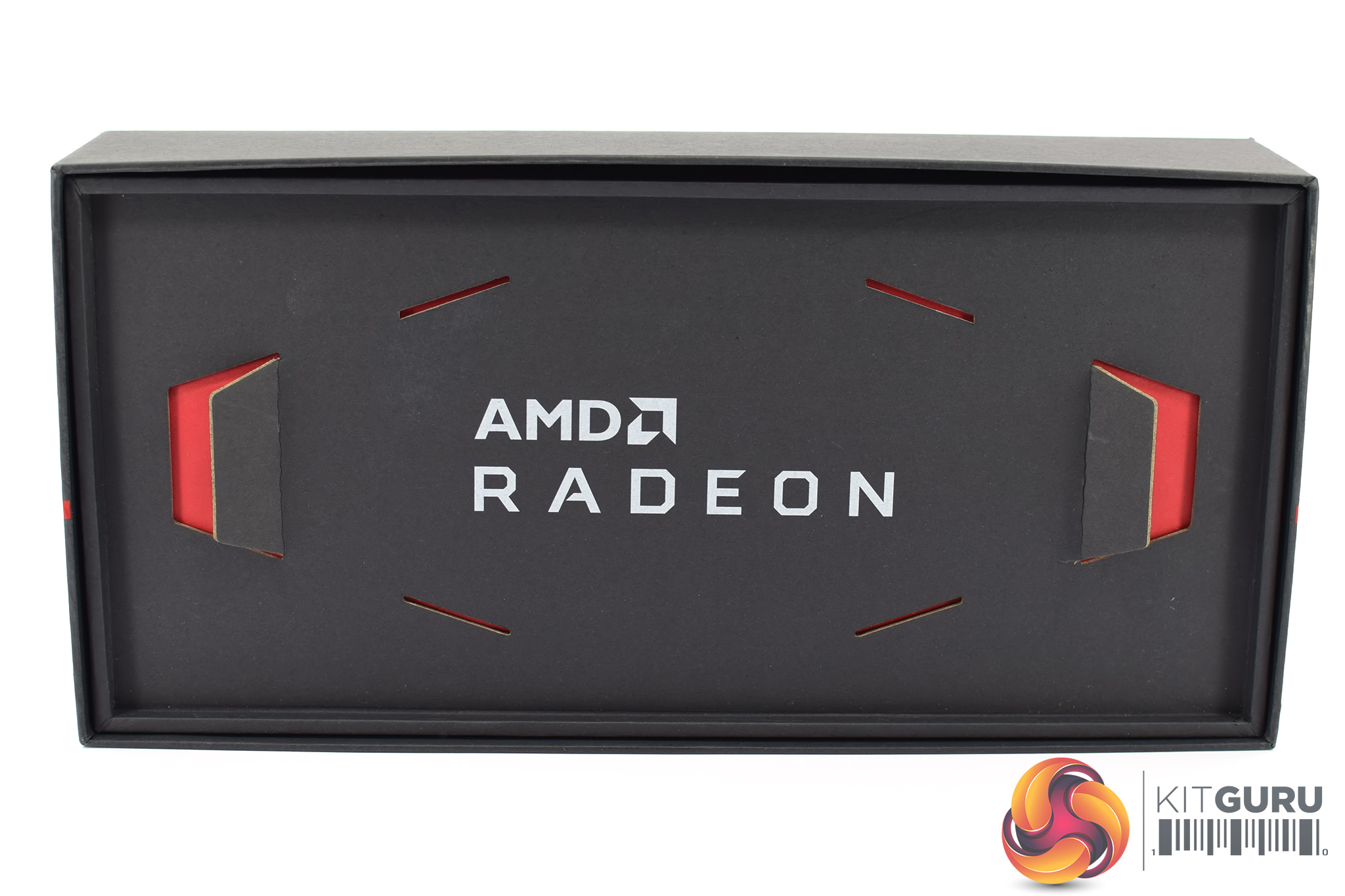 A smaller box slides out to reveal the AMD Radeon logo printed on a piece of cardboard. This acts a lid – you just need to lift by the pull-tabs to reveal the card housed underneath.