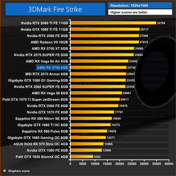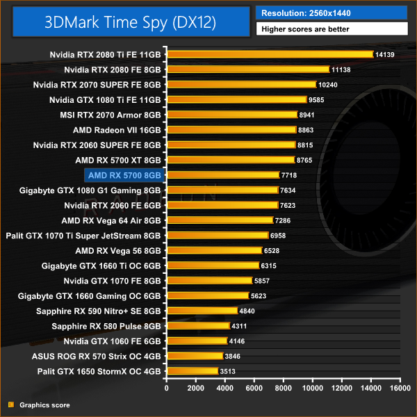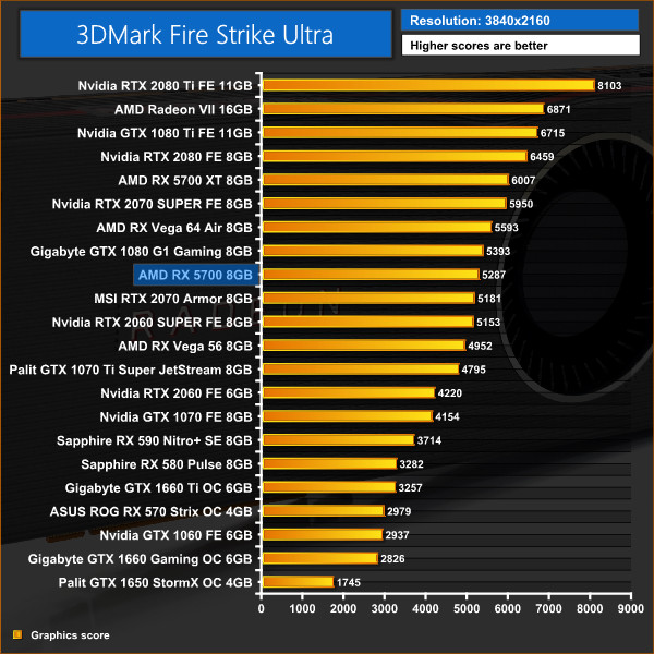 It's a very interesting start to our benchmarking for the RX 5700. Its Fire Strike and Fire Strike Ultra scores are ahead of both the RTX 2060 SUPER and RTX 2070, but the Time Spy test has both of those Nvidia cards in the lead. Games testing is going to be interesting.