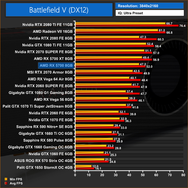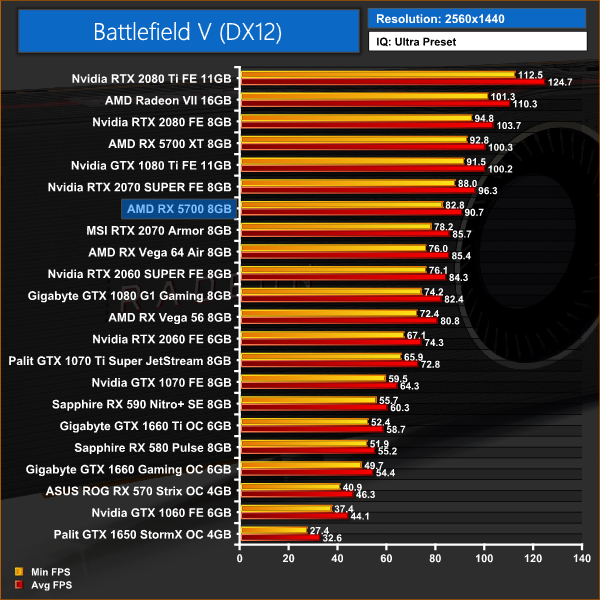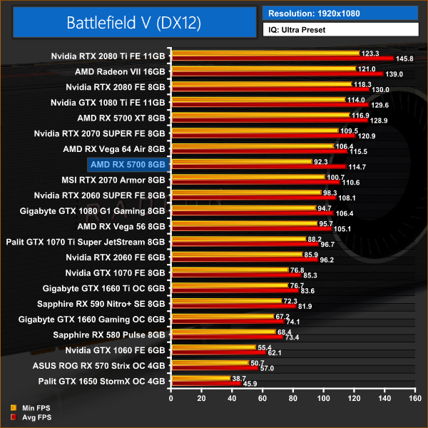 It was at this point when benchmarking, I began to wonder if I had installed the RX 5700 XT by mistake. But no, this is the performance of the RX 5700 in Battlefield V (DX12, it is important to stress). It's not only faster than RTX 2060 SUPER by about 8FPS at 1080p, but it's barely 6FPS slower than the 2070 SUPER – a card which costs $100 more.