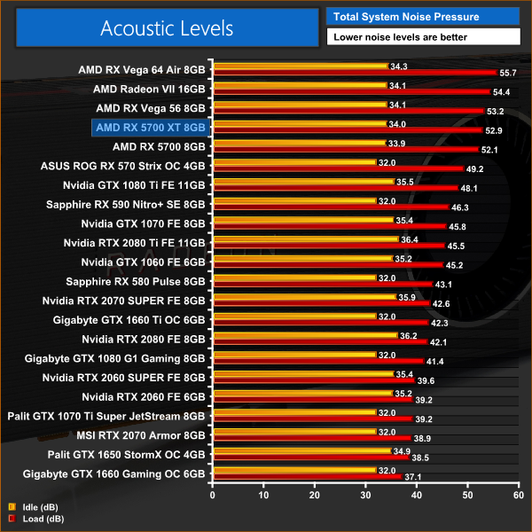 Both Navi cards perform similarly in terms of acoustics. Neither is quite as ear-shattering as Vega 64, but both are still very much on the loud side which is quite annoying. Once again we look to partner cards to reduce noise levels for AMD.