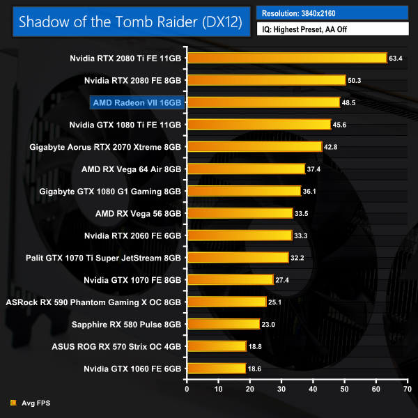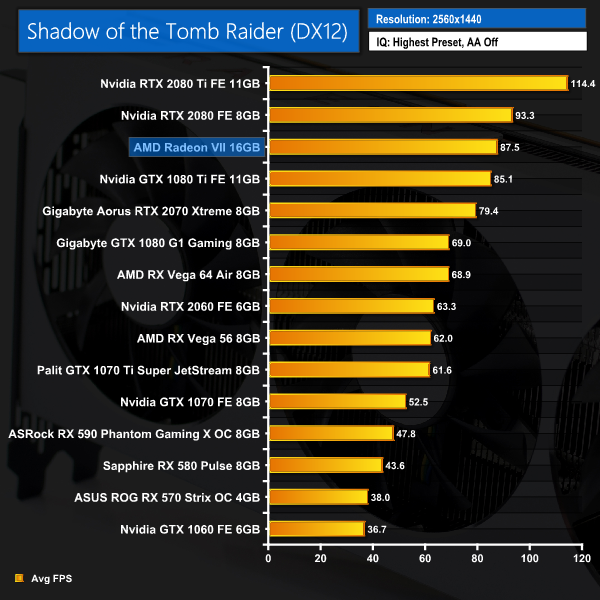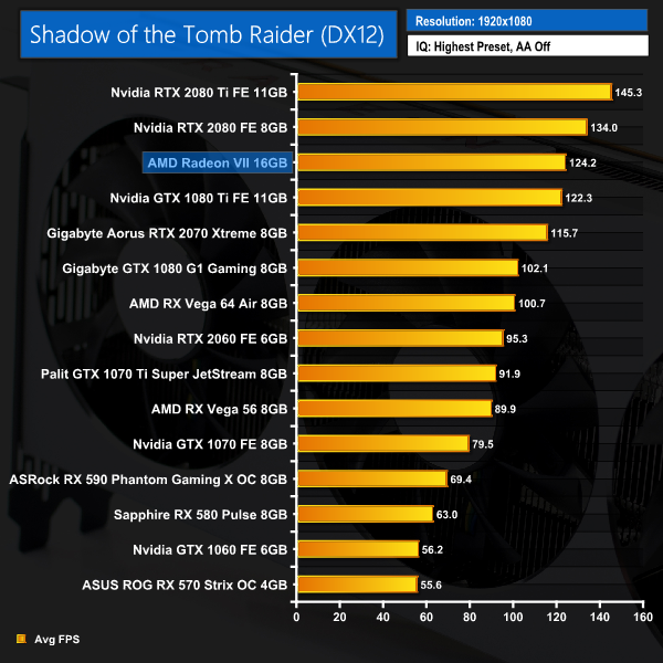 We finish our games testing with Shadow of the Tomb Raider, and the Radeon VII does fare better here. It still performs slightly slower than the RTX 2080 – there is a performance difference of 5.8FPS at 1440p resolution, for instance – but it does edge ahead of the GTX 1080 Ti and RTX 2070 across all three resolutions tested.