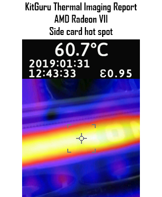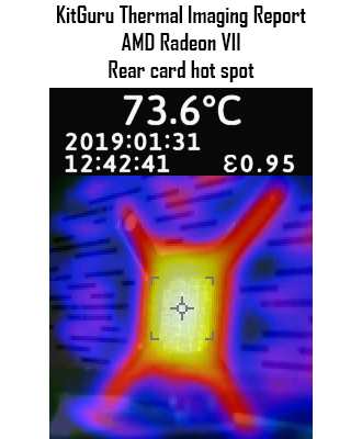 Taking a look at the card with our thermal gun shows no temperature spikes that we would worry about. Unsurprisingly, the hottest part on the card is directly behind the GPU core, but this didn't reach above 74C. The front side of the card didn't reach 61C, either, which is another good result.