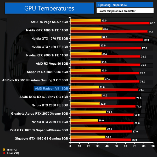 I have to say, thermal performance for AMD's reference Radeon VII is not bad at all. We saw the card peak at 74C, meaning it operates a full 12C cooler than Vega 64. There are several factors at play that help explain this, but I would suggest the move away from a blower-style cooler to the triple-fan setup on the Radeon VII is a big help – the only downside being it puts the onus of exhausting the card's hot air onto your system's cooling, rather than the card itself, but that is only really a problem when dealing with very compact cases.