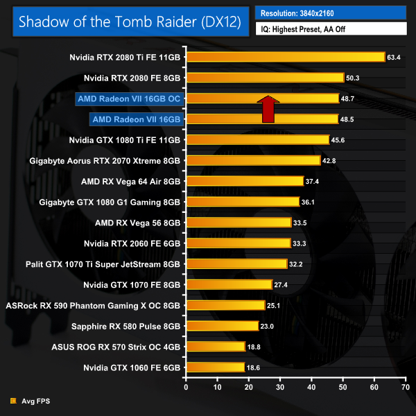 As you can see, despite this being the best overclock I managed with my Radeon VII, the performance increase is pitiful – barely a couple hundred points for the 3DMark benchmarks, and just an extra 0.2FPS when playing Shadow of the Tomb Raider.