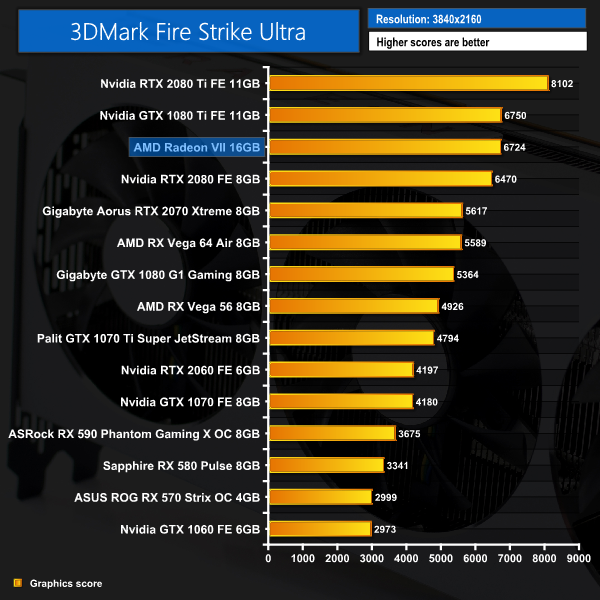 It's a promising start for the Radeon VII. It doesn't quite beat out the likes of the RTX 2080 or GTX 1080 Ti in Fire Strike or Time Spy, but it does nudge ahead of the RTX 2080 in Fire Strike Ultra – a 4K benchmark.