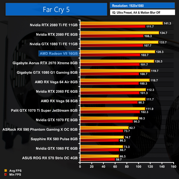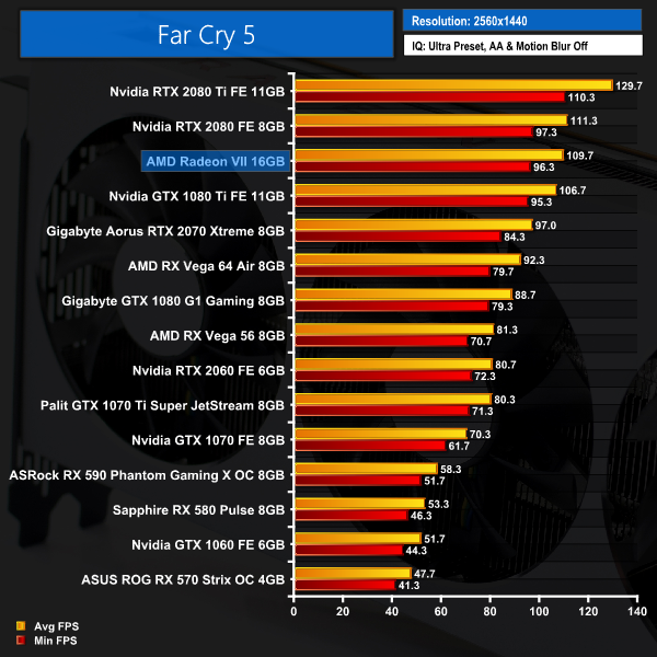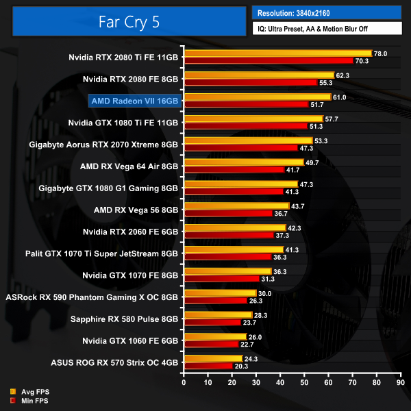 Far Cry 5 is the first game where we see the RTX 2080 begin to overtake the Radeon VII. Again, it's very much a case of small margins – but the RTX 2080 is 1-2FPS faster at 1440p and 4K resolutions.