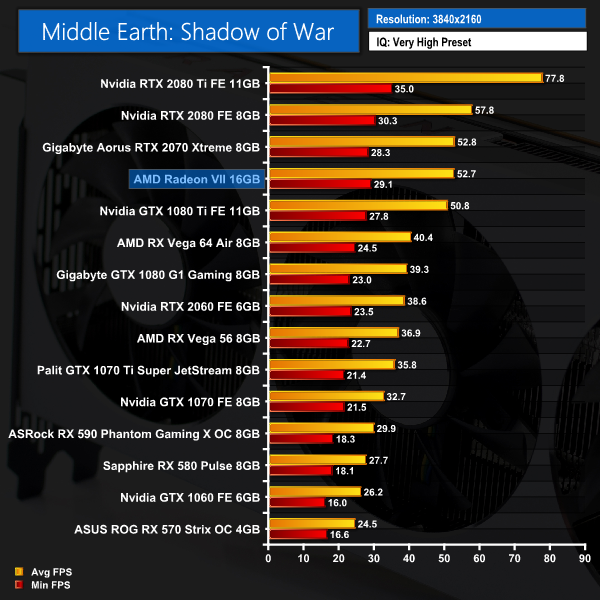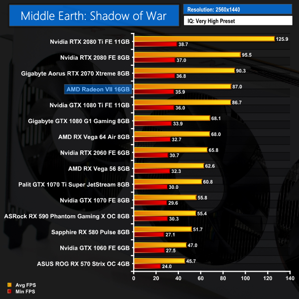 The Radeon VII is also beaten out by the Aorus RTX 2070 when we come to Shadow of War. The results here are closer than with Ghost Recon: Wildlands, but at 1440p for instance the RTX 2080 takes an 8.5FPS lead over the Radeon VII.