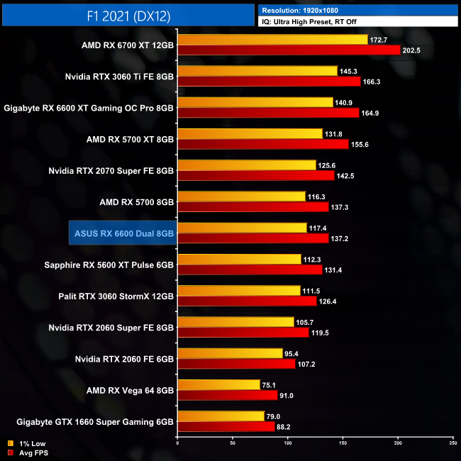 F1 2021 changes tack and we see the RX 6600 performing very well in this title, it averages 137FPS at 1080p making it 9% faster than the RTX 3060, essentially as fast as the RX 5700, while it's 17% slower than the RX 6600 XT.