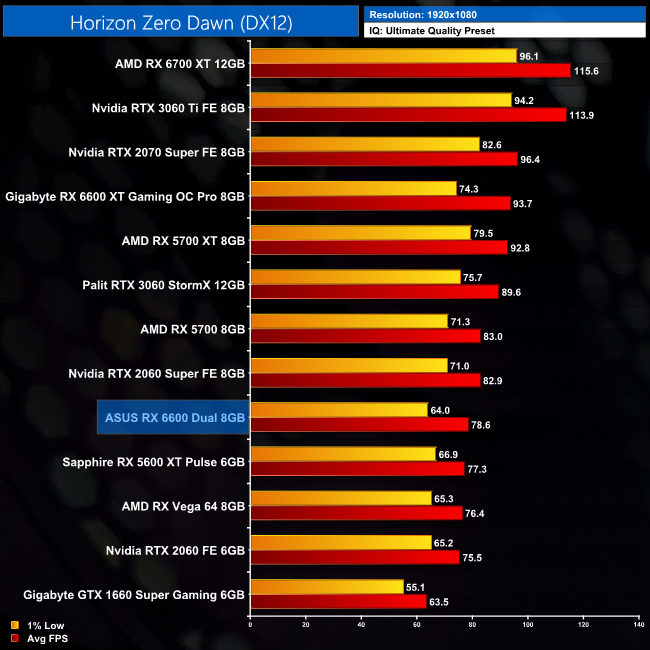 Next is Guerilla Games' Horizon Zero Dawn, running on the Decima engine. Once again we're seeing high frame rates at 1080p, with the RX 6600 hitting 79FPS using the highest quality settings. That's still not enough for it to match the RTX 3060 though, as it comes in 12% slower.