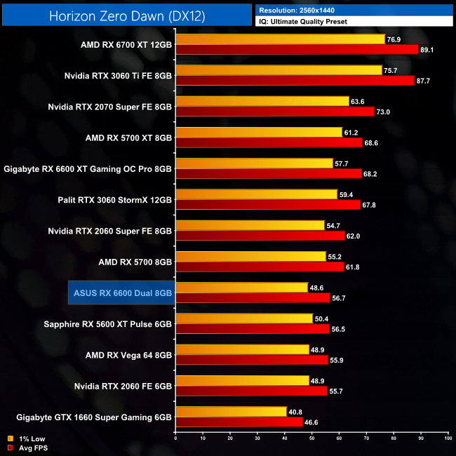 That increases to a 16% deficit at 1440p, while we can again see the RX 6600, RTX 2060 and RX 5600 XT are all on level pegging around the 56FPS mark.