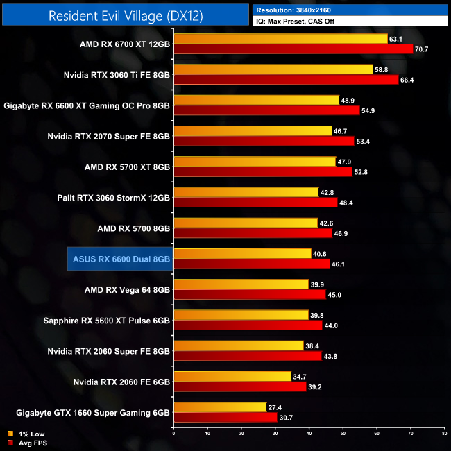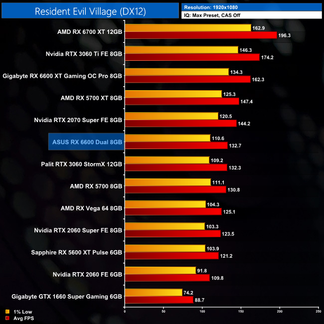 Resident Evil Village is another AMD-sponsored title, and using the latest iteration of the RE Engine we see the RX 6600 matching the RTX 3060 at 1080p. It's 18% behind the RX 6600 XT, but a good 10% faster than the RX 5600 XT.