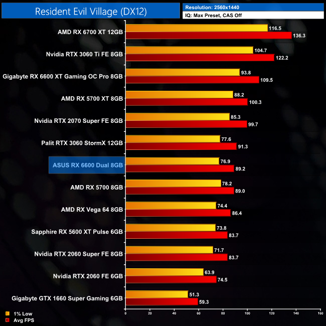 Those margins do slip slightly though at 1440p. The 6600 is 13% slower than the RX 6600 here and it is 7% faster than the RX 5600 XT. Considering the GPU averages 89FPS though, it's still delivering a very smooth experience.