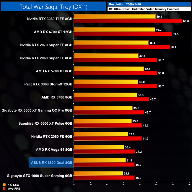 We had some fun and games with Total War Saga: Troy for this review. It seems between now and my previous testing of this game for the RX 6600 XT's launch in August, an update came along and reduced performance for all of the GPUs tested. Interestingly, it seemed to have the biggest negative impact on the 6600 and 6600 XT, as the 6600 is actually 11% slower than the 5600 XT at both 1080p and 1440p. My guess is the limited memory bandwidth could be a factor here, as could the PCIe Gen4 x8 configuration which we're running at Gen3 x8 due to using the Z490 platform.