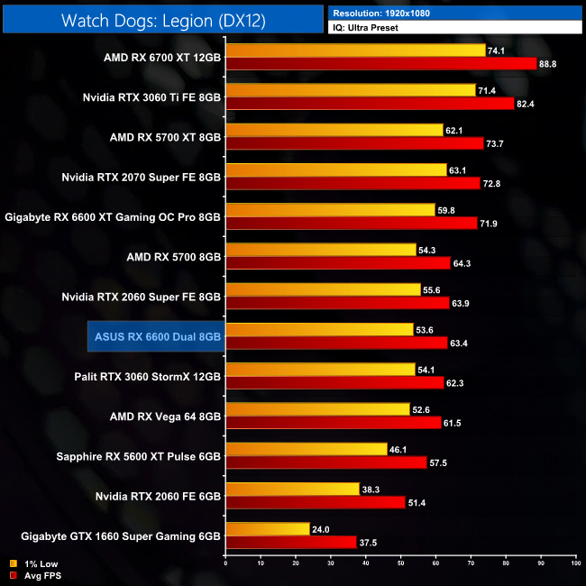 Lastly, we close out with Watch Dogs: Legion. Despite being an Nvidia sponsored title, AMD's GPUs do well here and the 6600 is just a touch faster than the RTX 3060 at 1080p, while it's also 10% faster than the RX 5600 XT.