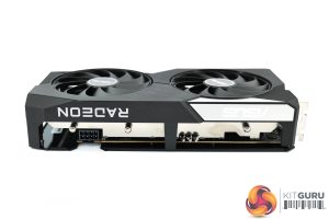 Over on the front edge of the shroud we can note the ASUS and Radeon logos, while a metal backplate is also visible once we turn the card over. It's entirely black apart from the silver ASUS logo, while there's a cut-out behind the GPU die.