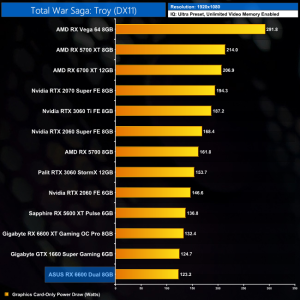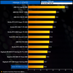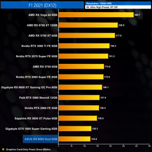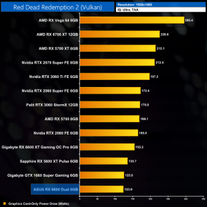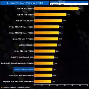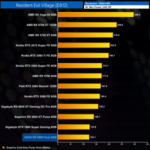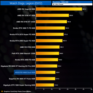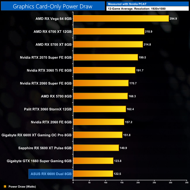 Power draw is exceptionally low for the RX 6600. Over our 12 games tested, it averaged 122.5W at 1080p, lower than even the GTX 1660 Super (which is a significantly slower GPU). As you can see from the individual charts above, power draw was also very consistent across the 12 games we tested.