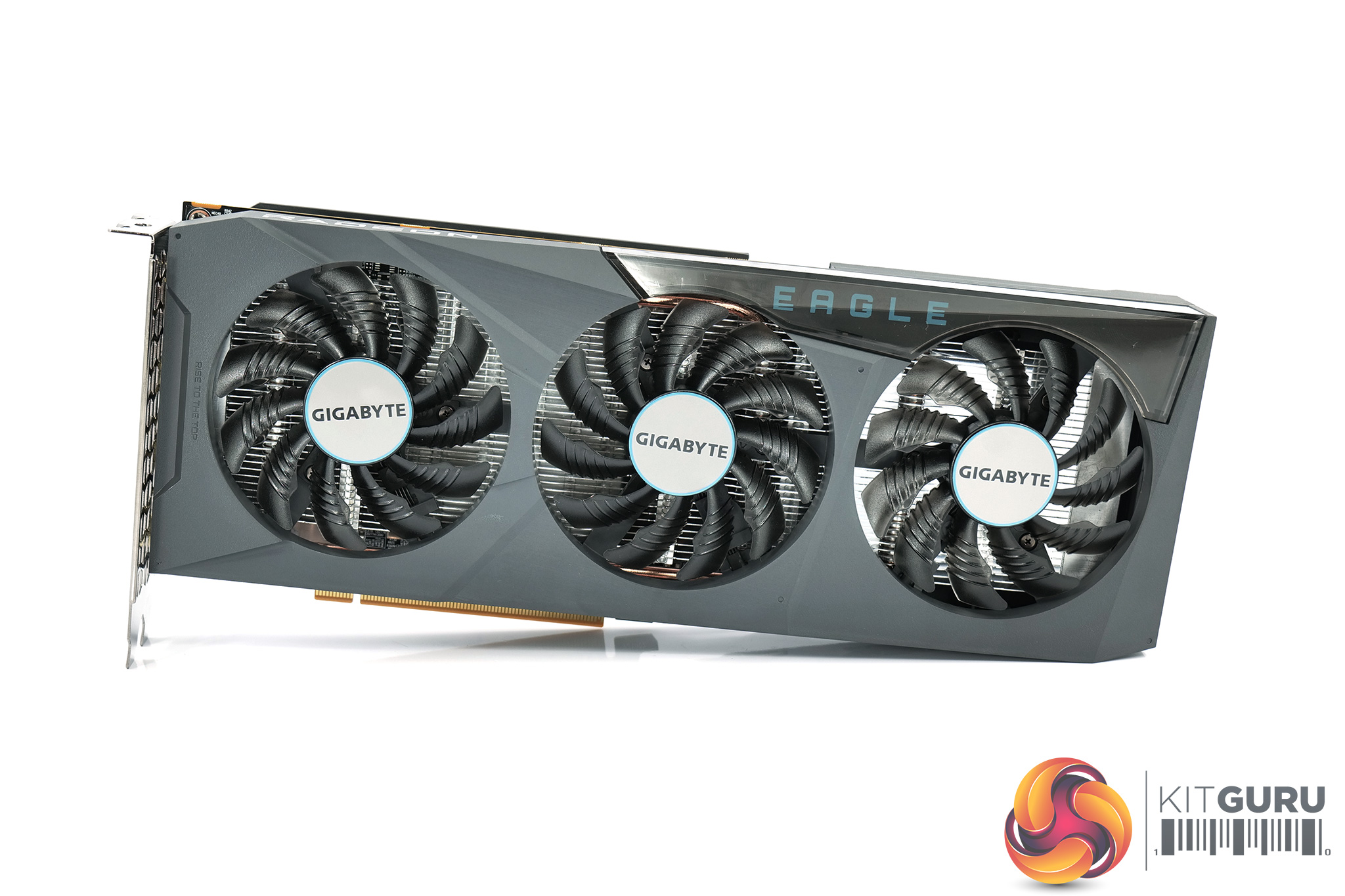 Looking at the graphics card itself, it will be a familiar design to many as we have already reviewed a handful of Gigabyte Eagle models this generation. It's a dark grey colour, using a plastic shroud, but with a translucent section towards the end of the shroud through which the Eagle logo can be seen.