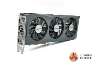 Gigabyte is sticking with a triple-fan design for its RX 6600 offering, though these fans are smaller at 80mm across. As always with a Gigabyte graphics card, the central fan spins in reverse relative to the outer two which should reduce turbulence and thus increase airflow pressure down onto the heatsink.