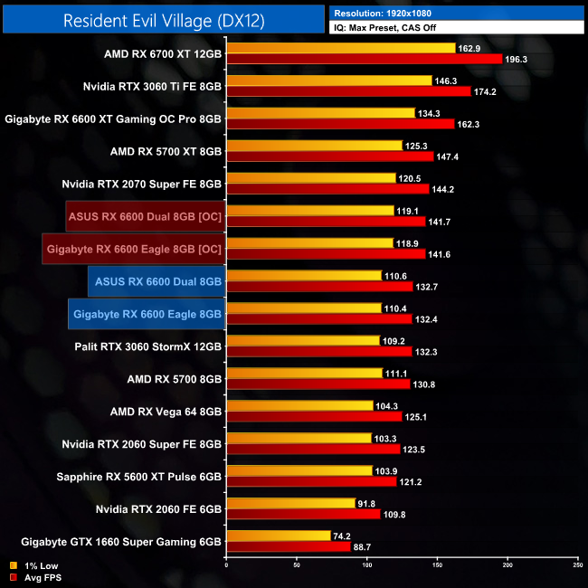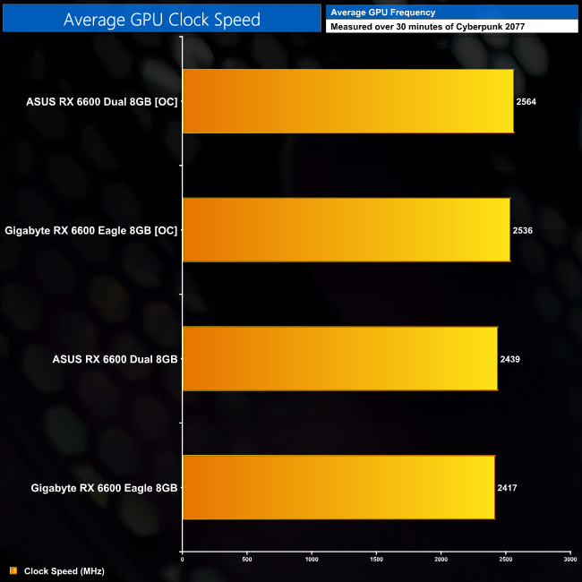 With both GPUs overclocked to their limits, the Eagle gained an extra 119MHz, while the Dual gained 125MHz to its average frequency under load.