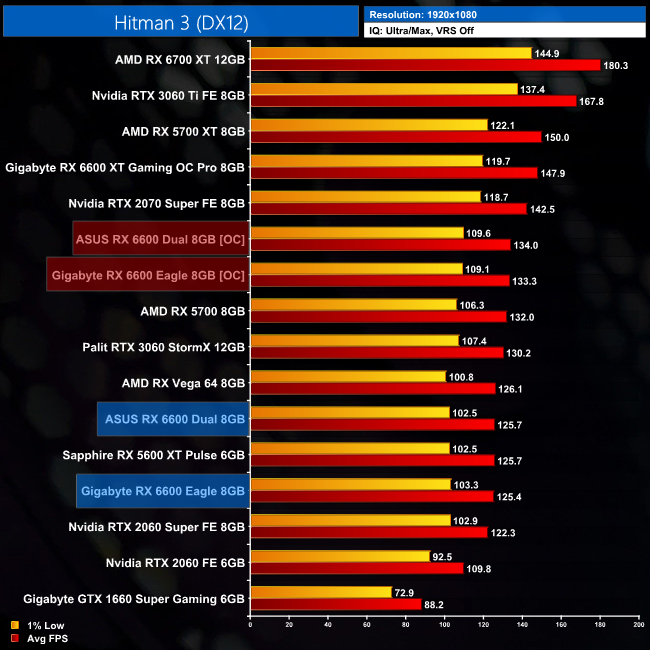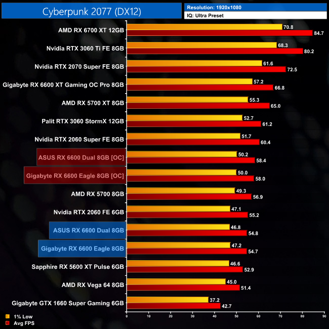 These overclocks resulted in pretty consistent gains of 6-7% for both models tested. I think we probably could have got more out of them, but the memory overclocking slider is limited to just 1900MHz (when 1750MHz is stock), and I think it could probably go further.