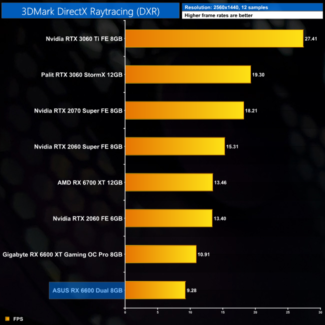 3DMark's DXR feature test is an intensive benchmark that is entirely ray traced. We know from months of testing that AMD's 1st generation of hardware accelerated ray tracing isn't at the same level as Nvidia's 2nd generation implementation found in its Ampere GPUs, so it's not a surprise to see the 6600 sitting bottom of the pile, slower than even the RTX 2060 by a whopping 31%.