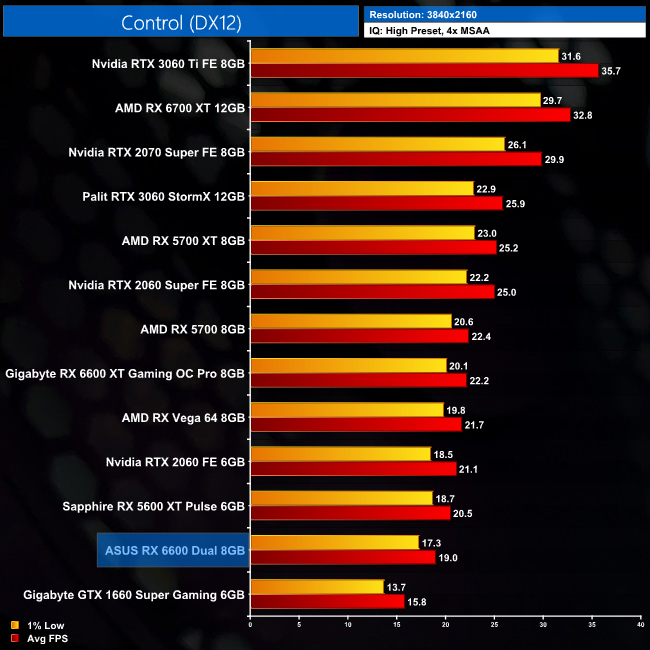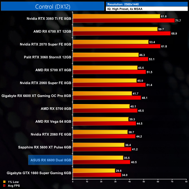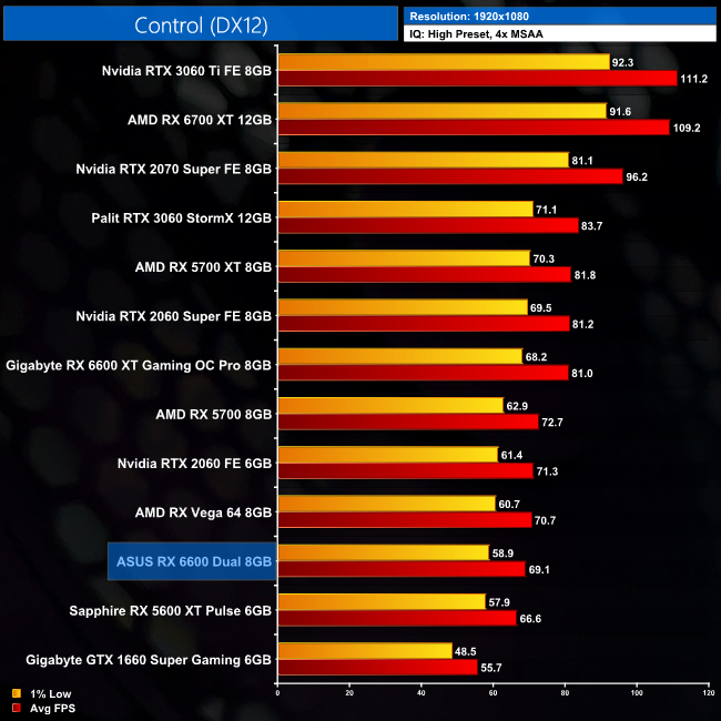 Control is next and by now we are all aware that this Nvidia-sponsored title runs best on… Nvidia hardware. The 6600 still does OK at 1080p, averaging just under 70FPS, but it's well behind the RTX 3060 and even falls 2FPS short of the RTX 2060.