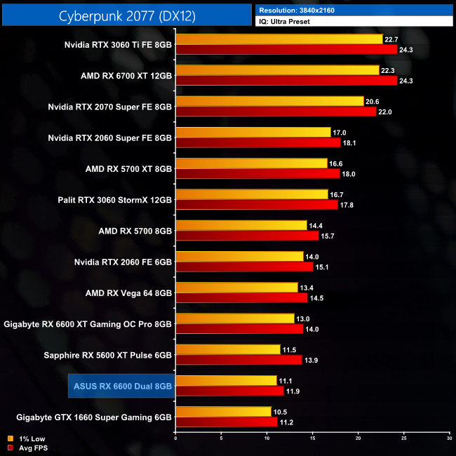 Next we look at Cyberpunk 2077, one of the most demanding titles in our test suite. At 1080p, using Ultra settings, the RX 6600 delivers just under 55FPS on average, putting it 11% behind the RTX 3060 while it's on par with the RTX 2060.