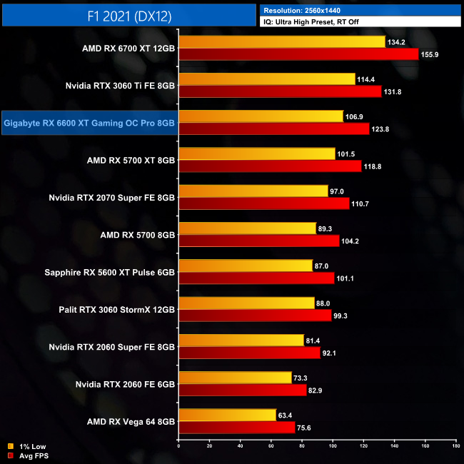 Stepping up to 1440p, the 6600 XT is still 25% faster than the RTX 3060, a slightly small gap between those two cards, but still a very clear victory for AMD. Against the RTX 3060 Ti however, the 6600 XT is now 6% slower – but at the end of the day we're still looking at over 120FPS on average, so we can't really complain.