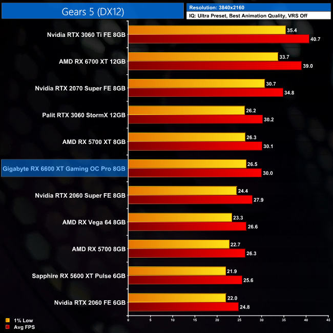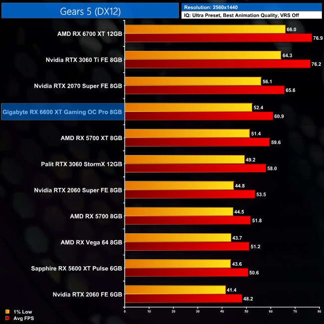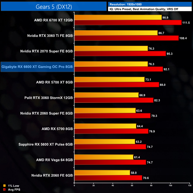 Gears 5 brings things back down to earth for the RX 6600 XT. At 1080p it is able to deliver 92FPS on average, giving it a healthy 12% lead over the RTX 3060, but we're once again looking at a similarly-sized deficit when compared to the RTX 3060 Ti. We can also see a tiny lead over the RX 5700 XT, with a difference of just 4FPS between those cards.