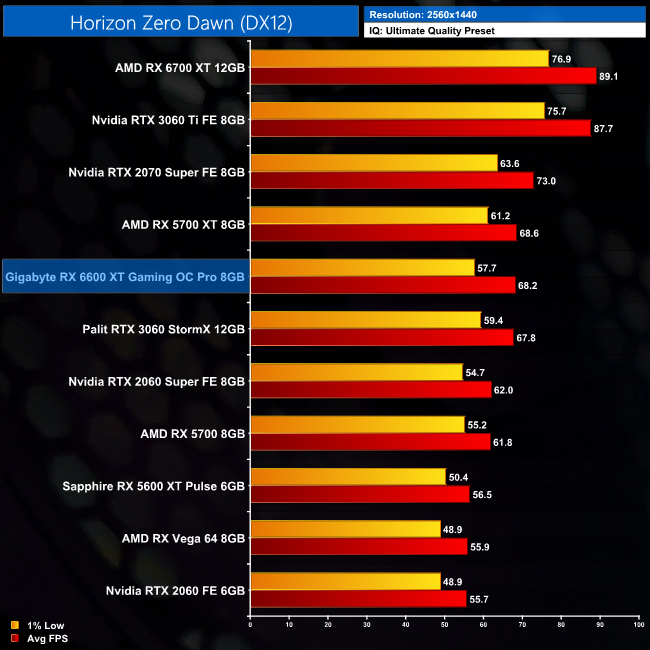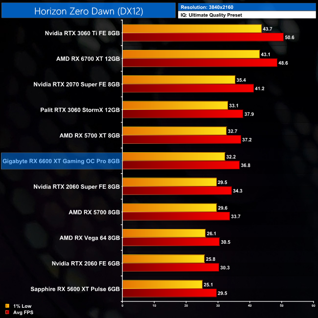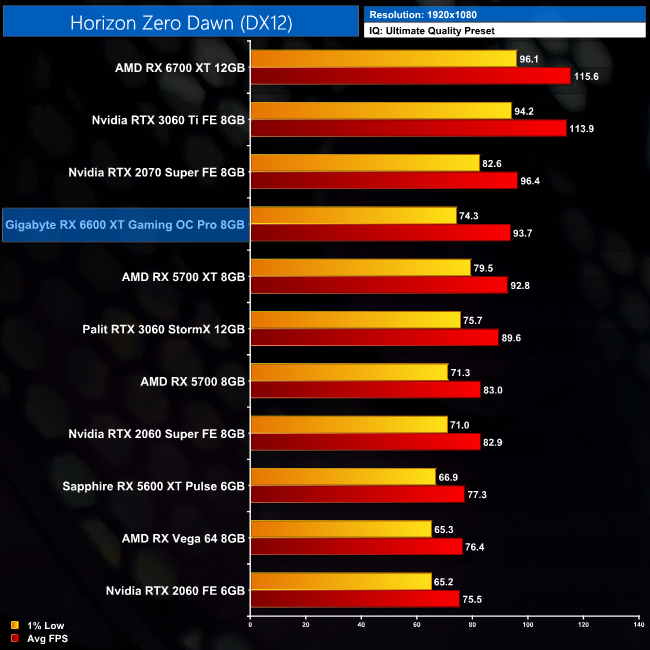 Horizon Zero Dawn is a much closer affair, with only a 5% margin separating the RX 6600 XT and the RTX 3060. The RX 5700 XT is also fractionally slower in terms of the average frame rate, but its 1% low performance is actually better than the 6600 XT by around 7% or so.