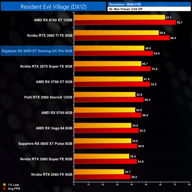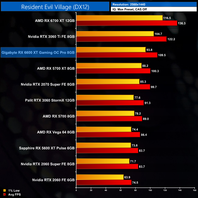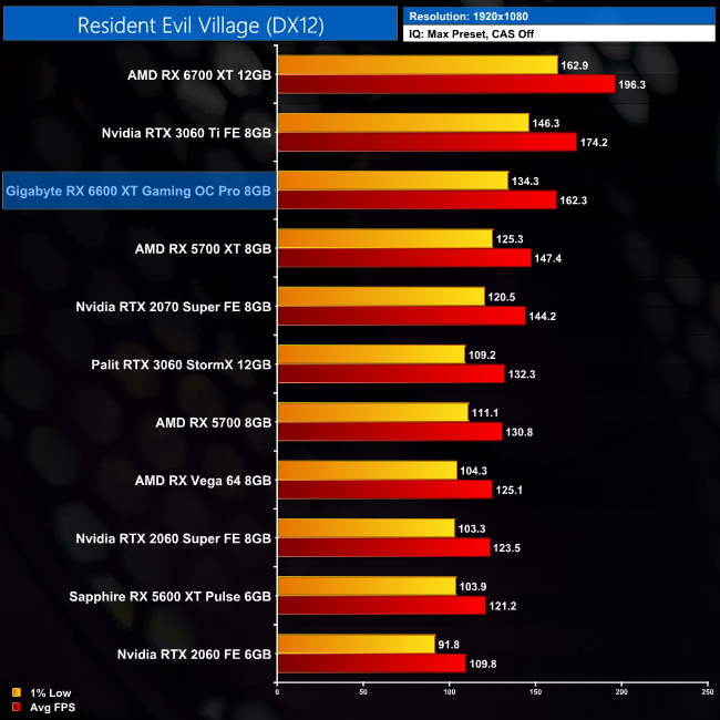 Resident Evil Village is the last AMD-sponsored title that we test, and the RX 6600 XT does produce the goods here. It averages over 160FPS at 1080p, giving it an impressive 23% lead over the RTX 3060. We can even see the 6600 XT's biggest win over the RX 5700 XT here, to the tune of 10%, with this new game best placed to get the most out of RDNA 2 compared to the original RDNA architecture.