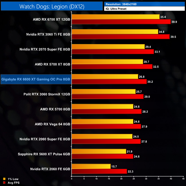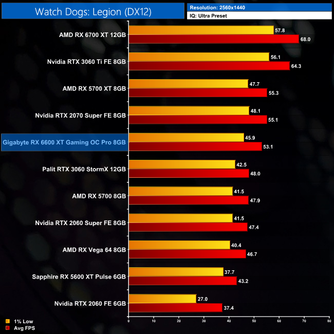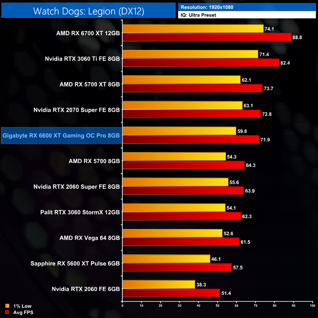 Finally, we finish up with Watch Dogs: Legion. Interestingly, despite being an Nvidia-sponsored title, the RX 6600 XT is a good 15% faster than the RTX 3060 at 1080p. It's still 13% behind the RTX 3060 Ti, but it's definitely better than you might have thought.