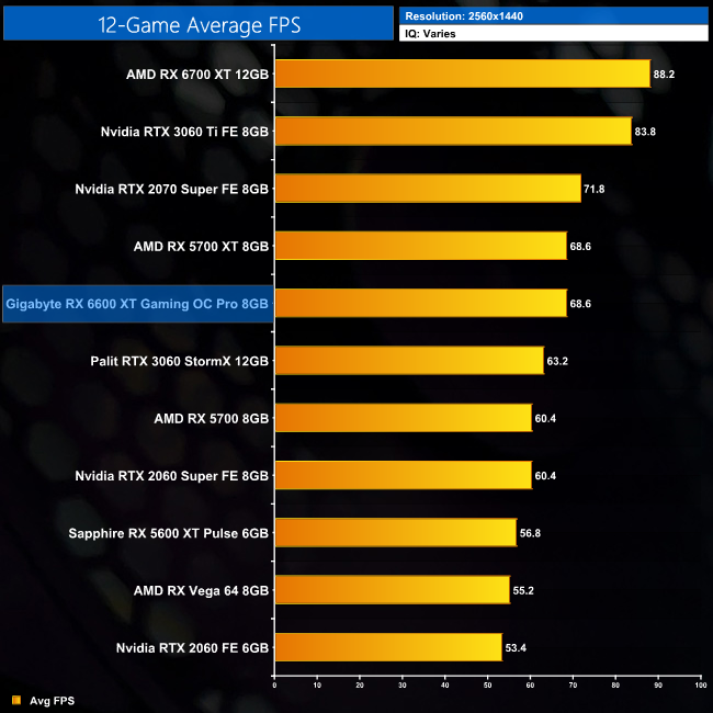 At 1440p, the 6600 XT does fall away slightly, as it's now 9% faster than the RTX 3060, rather than the 12% margin we saw at 1080p. Compared to the RTX 3060 Ti, we're looking at an 18% difference, which really puts these GPUs in different performance categories. Interestingly, the 6600 XT and RX 5700 XT have the exact same average frame rate at this resolution, which shows you just how similar they are.