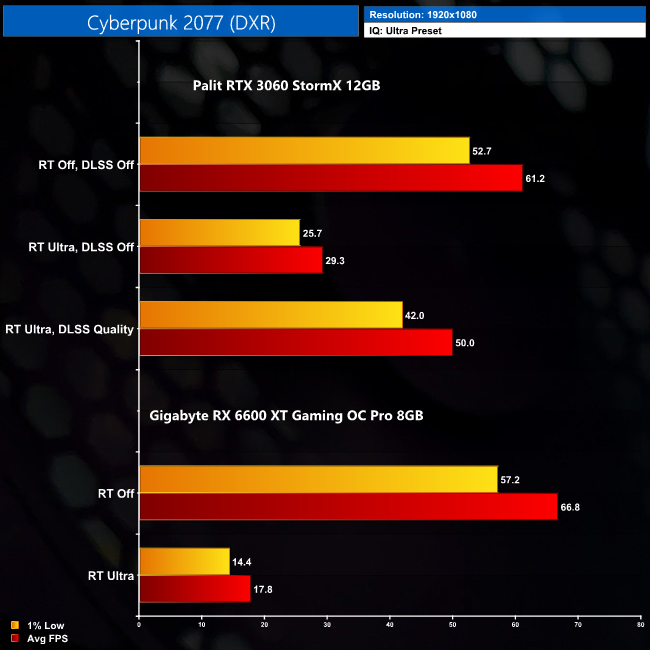Add in DLSS and we can see the RTX 3060 runs away with it in this head-to-head, delivering almost three times the frame rate of the RX 6600 XT. DLSS may not be perfect at 1080p, but considering the boost to performance it can offer, it's definitely something to factor in.