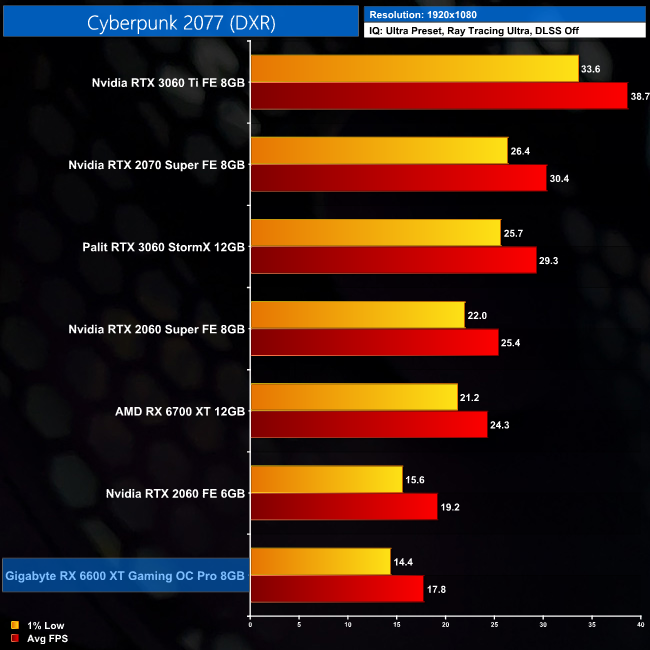 Kicking off our look at ray tracing performance, we know AMD GPUs struggle with the array of ray traced lighting effects found in Cyberpunk, so it's not a surprise to see the RX 6600 XT sitting bottom of the chart at every resolution. Even at 1080p, the two-year old RTX 2060 is outpacing AMD's new GPU.