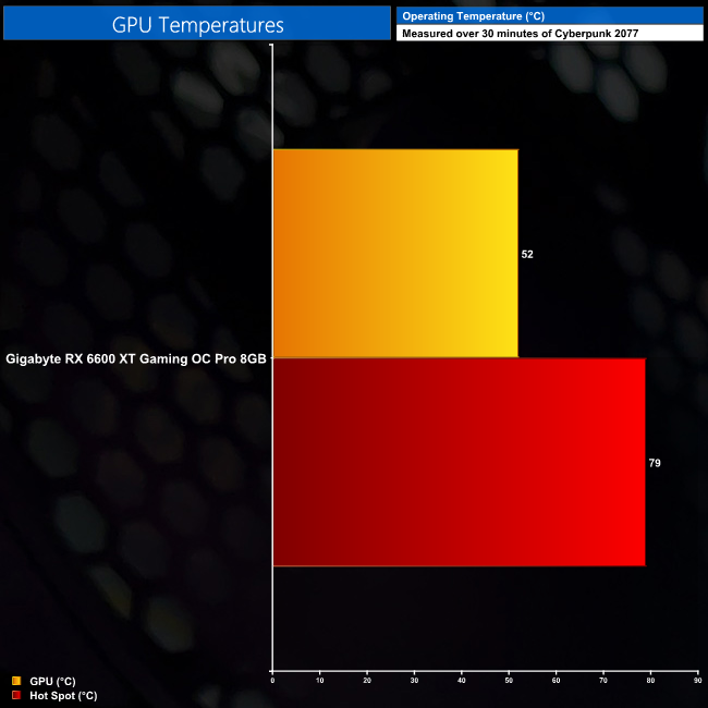 As this is the first and only RX 6600 XT we have tested for launch day, we don't have any comparison data for the Gigabyte Gaming OC Pro model. However, as we expected due to its size and heatsink layout, it is clearly a very proficient cooler, delivering a peak GPU temperature of just 52C, while the hot spot hit 79C.
