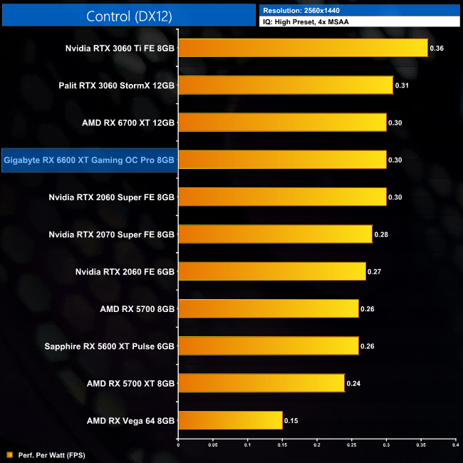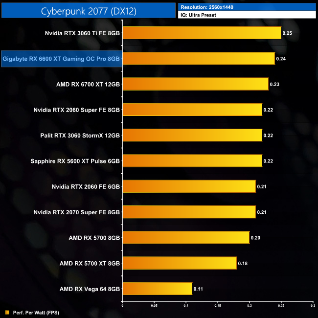 Even at 1440p, where the RX 6600 XT isn't as strong as it is at 1080p, the efficiency data is highly impressive – it's level with the RTX 3060 Ti, but still delivers 34% better performance per Watt than the RX 5700 XT, and we're not even going to mention Vega 64 at the bottom of the chart there…