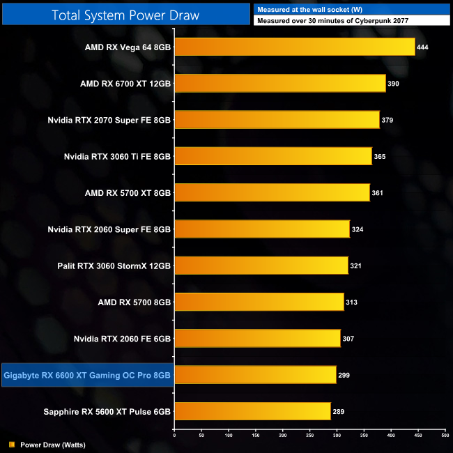 We measure system-wide power draw from the wall while running Cyberpunk 2077 for 30 minutes.